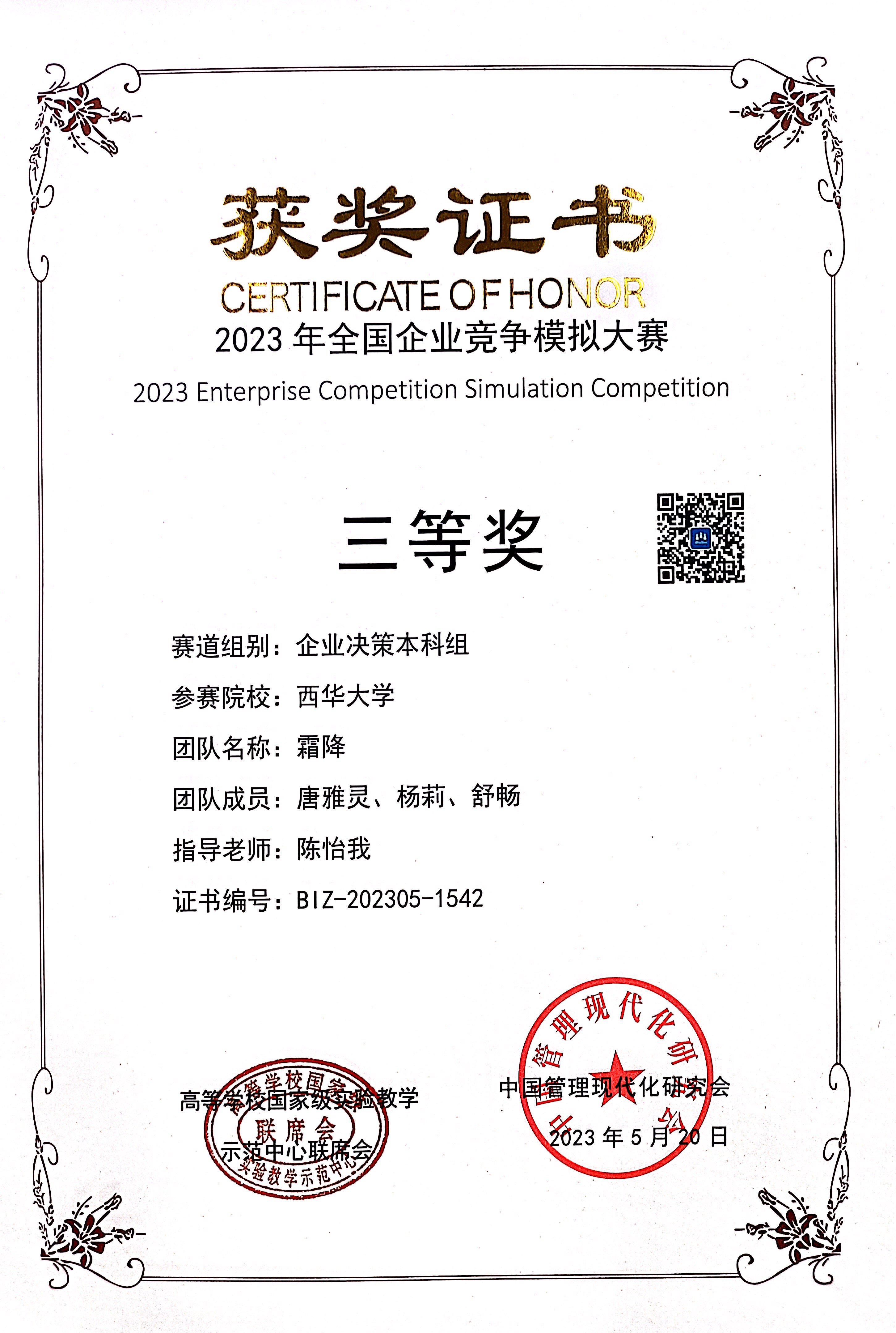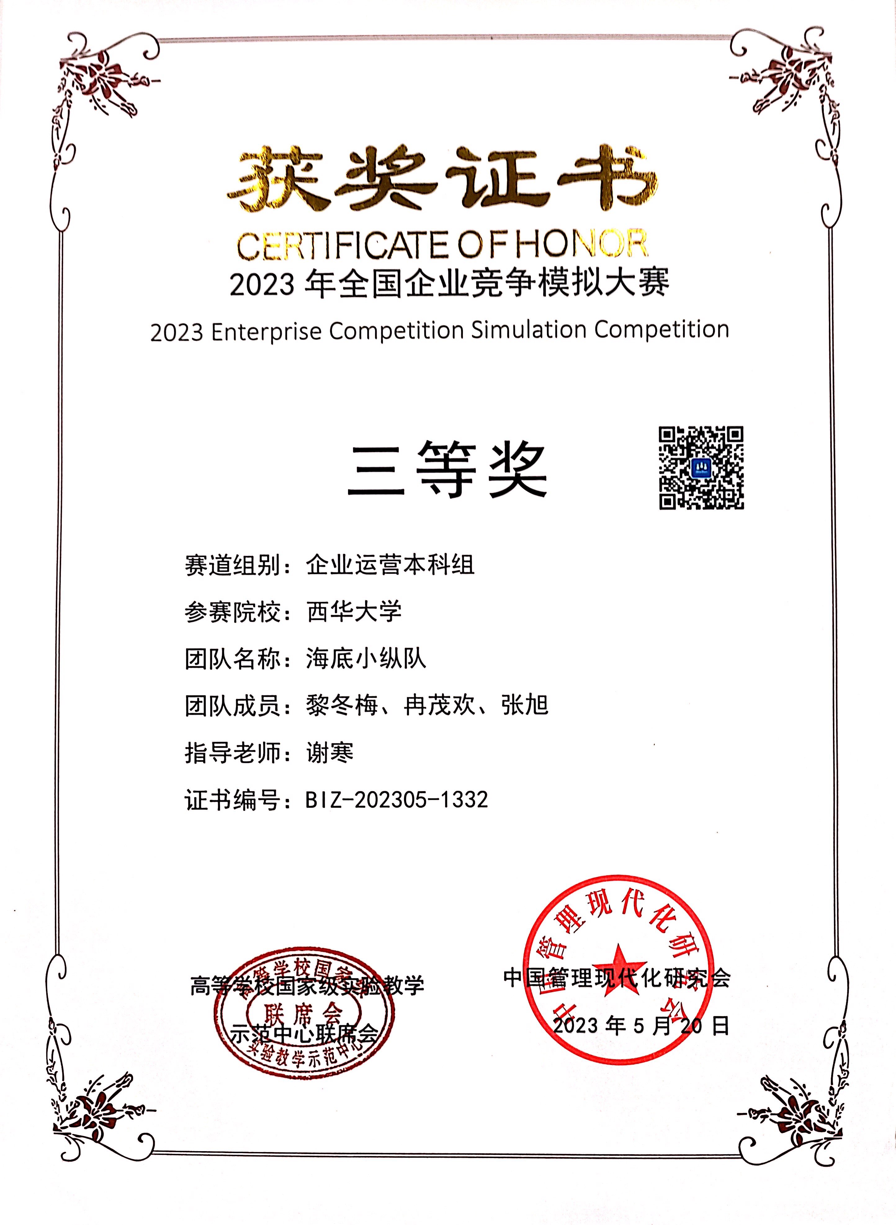 经过激烈的比赛,在5月23日公布的获奖名单中,我院学子黎冬梅、冉茂欢、张旭、唐雅灵、杨莉、舒畅、张风宝、周华、肖梓成、李宏、万新坤、张苏在指导老师谢寒、陈怡我、刘丹萍和丁灿指导下喜获全国二等奖两项,三等奖两项,获奖公示比赛网站链接http://www.ibizsim.cn/main/news/259。