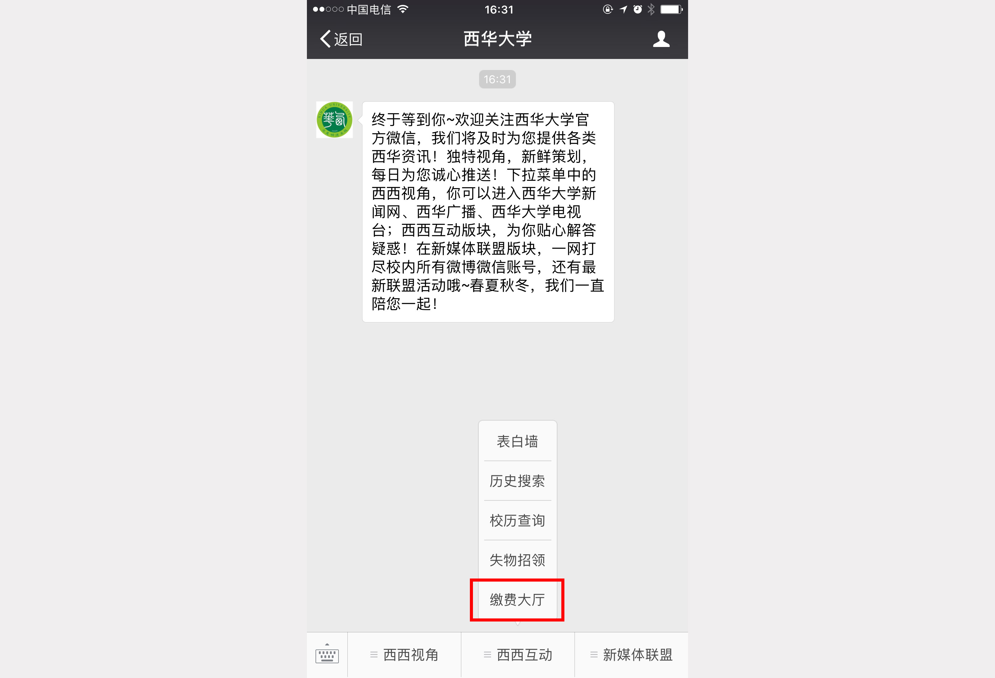 1.5.进入公众号主界面,点击菜单进入“西西互动”“缴费大厅”