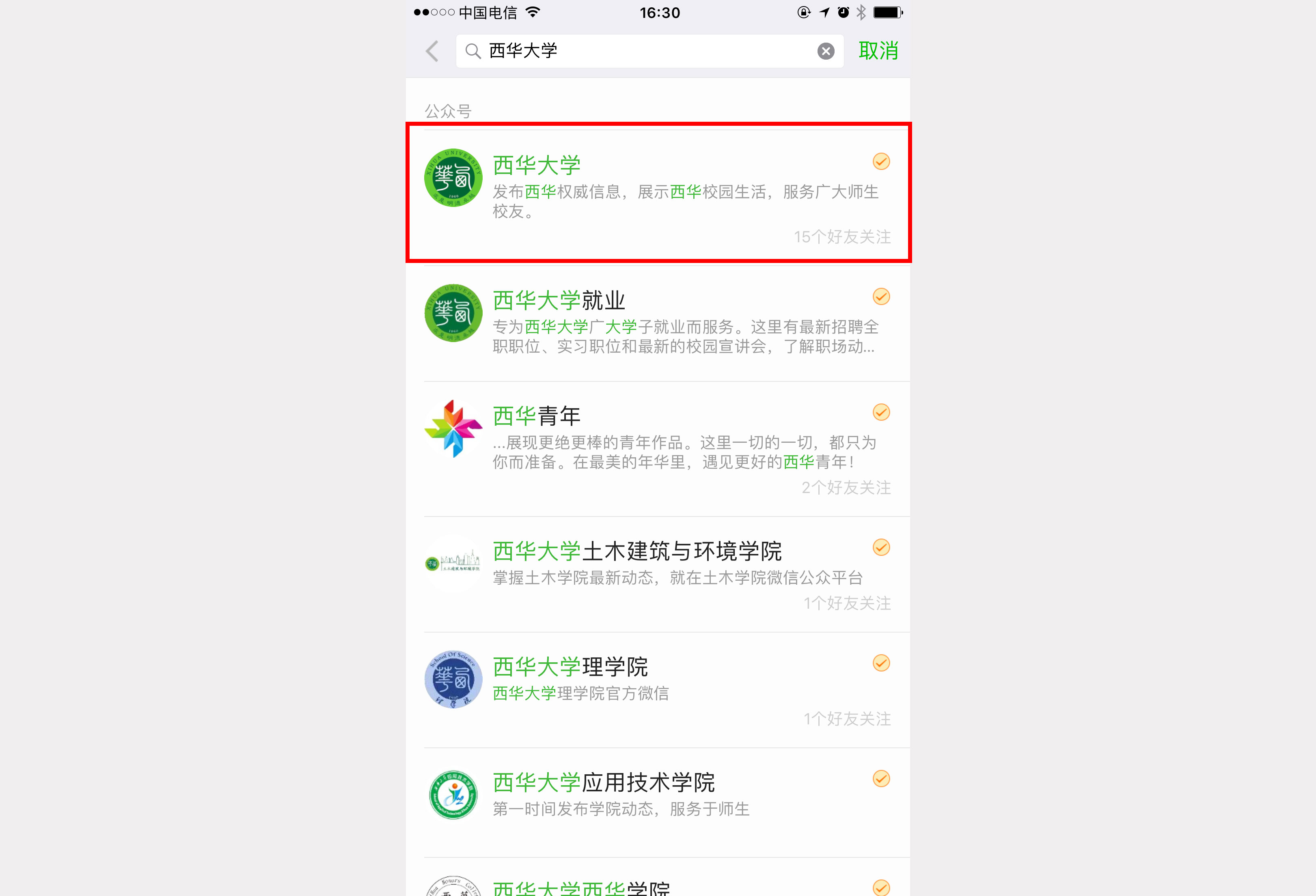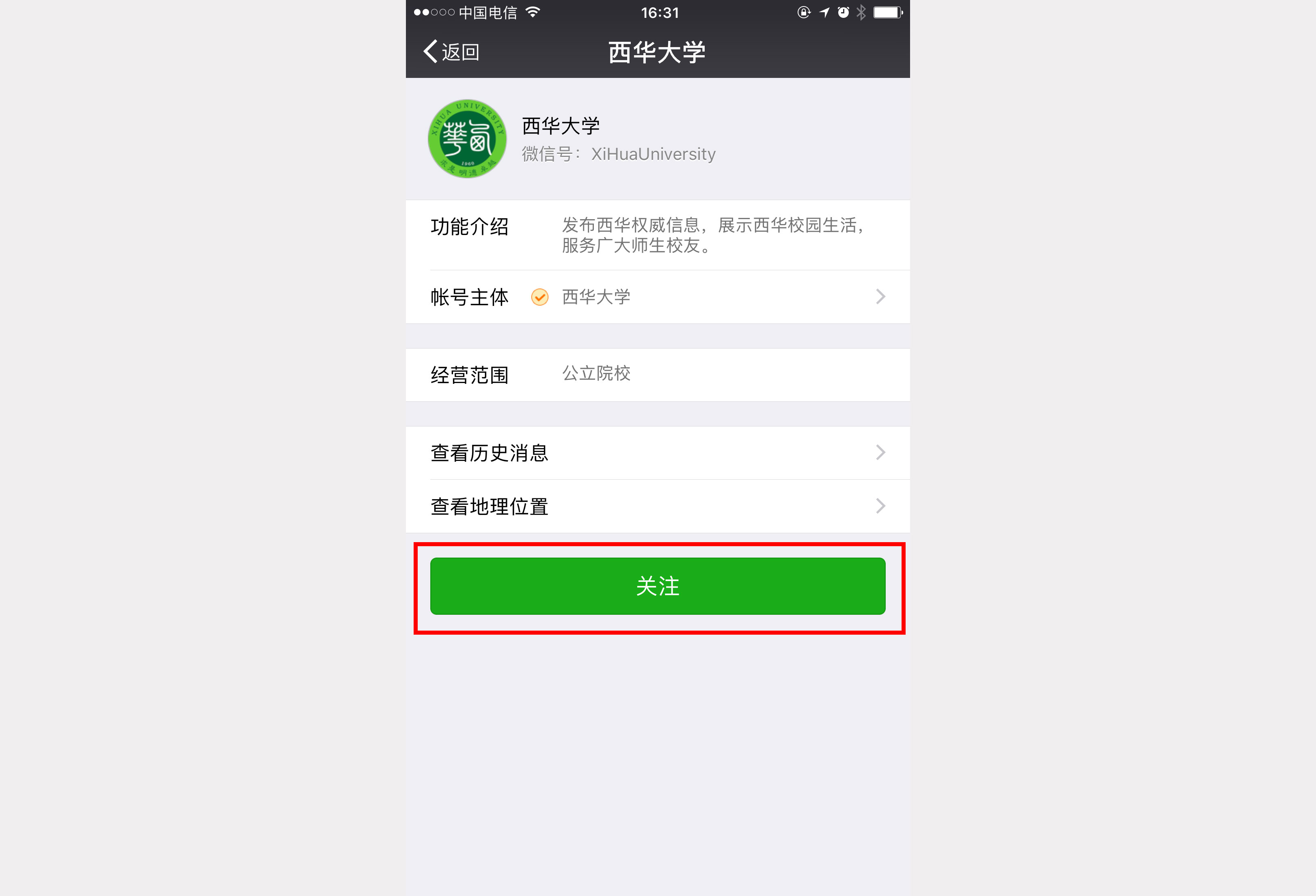 1.4、 点击关注按钮,关注学校公众号