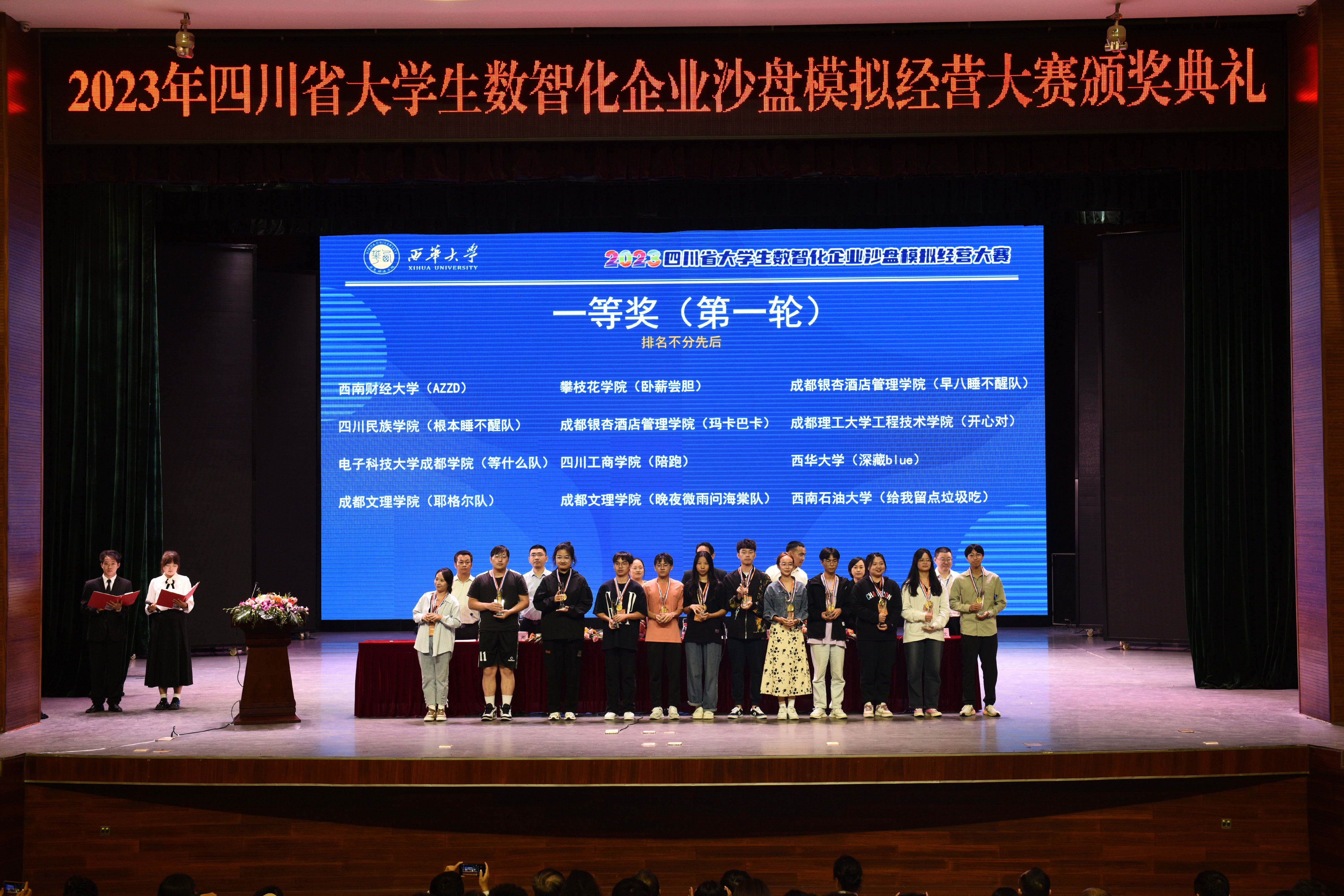 大赛颁奖典礼于924日下午在betway88西汉姆联艺术大楼大剧场举行。betway88西汉姆联副校长费凌、四川省教育厅高教处干部杜敏通、betway88西汉姆联教务处处长蒋珍菊、新道科技股份有限公司助理总裁侯爱华、betway88西汉姆联管理学院院长赵修文、新道科技股份有限公司西南区副总经理瞿刚、四川农业大学经济学院院长蒋远胜、四川轻化工大学管理学院院长黄英杰、西南石油大学经济管理学院副院长彭双、成都信息工程大学管理学院副院长李贵卿、西南财经大学教授邹燕出席、betway88西汉姆联教务处副处长陈明军,以及来自省内各高校的参赛学生、指导老师参加了颁奖典礼。颁奖典礼由管理学院党委书记肖东华主持。