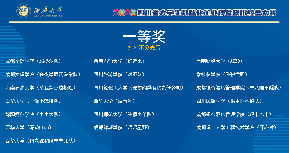 四川省大学生数智化企业沙盘模拟经营大赛是四川省教育厅主办、入选教育部竞赛榜单的赛事,本次大赛于2023年7月正式启动,比赛分为新工科组和新文科组两个赛道,赛事吸引了来自全省46所本科院校186支队伍740余名学生参与,最终115支队伍晋级省决赛。