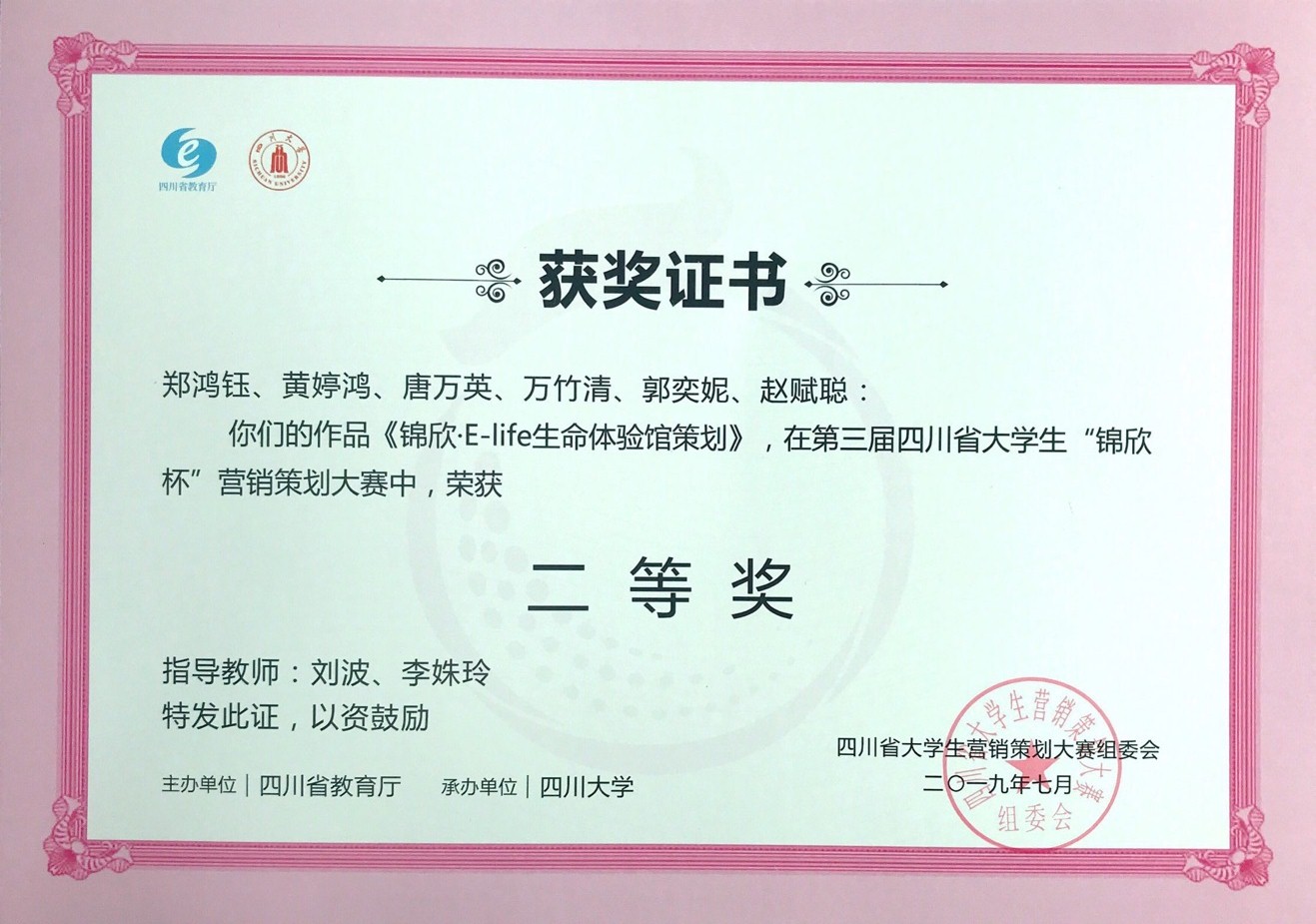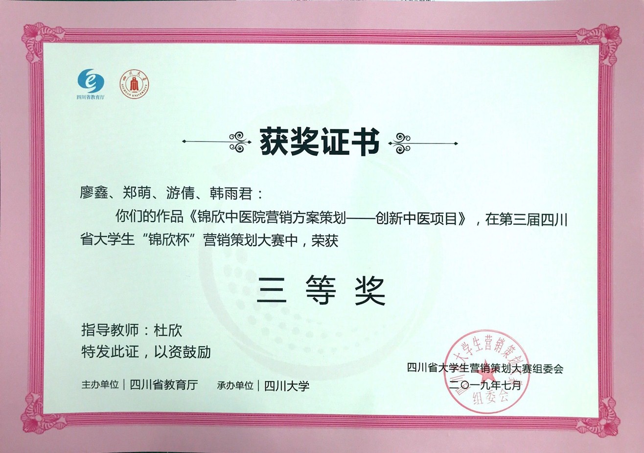 近日,由四川省教育厅举办,四川大学承办的第三届四川省大学生“锦欣杯”营销策划大赛的最终比赛结果已经揭晓。我校管理学院刘波老师、陈怡我老师、李姝玲老师指导的tan45°团队、郭美汤车林团队分别获得了省级二等奖和三等奖;西华学院杜欣老师指导的潜心梦雨团队获得了省级三等奖。
