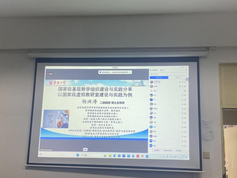 杨洪涛教授首先对“教育部高等教育司关于开展虚拟教研室试点建设工作的通知”进行详细解读,以国家级基层教学组织建设与实践为例进行分享,具体包括虚拟教研室建设分类介绍、国家市场营销课程教学虚拟教研室建设情况、如何进行虚拟教研室的资源建设、如何进行虚拟教研室的线上教研以及如何准备佐证材料等方面。杨洪涛教授特别针对虚拟教研室的资源建设和线上教研活动的开展进行了详细讲解,分享如何进行线上课程网站教学资源建设、线上课程知识图谱建设、课程配套教材建设、教学课件的建设,以及教研主体如何进行组织与建设、如何进行线上教学专题研讨以及如何激活虚拟教研室各单位的积极性。讲座结束后,线上参与的各位老师就课程建设、教学中的问题与杨教授进行了交流研讨。