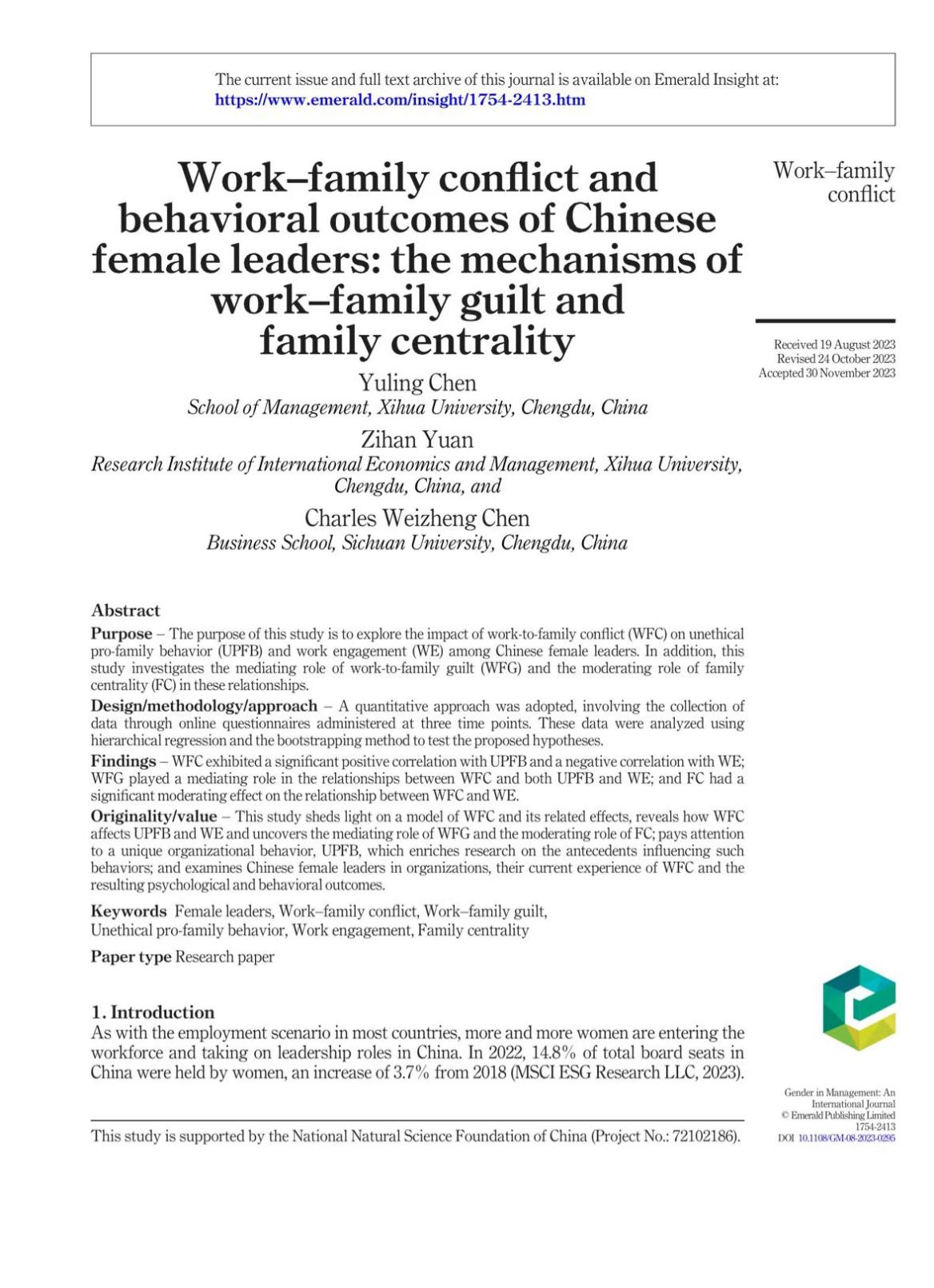 此外,管理学院、国际经济与管理研究院陈玉玲副教授研究团队在女性研究领域国际期刊《Gender in Management: An International Journal》(SSCI 一区)发表题为“Work-family conflict and behavioral outcomes of Chinese female leaders: the mechanisms of work-family guilt and family centrality”的研究论文。陈玉玲副教授为论文的第一作者,国际经济与管理研究院2021级工商管理专业硕士研究生袁梓涵、四川大学陈维政教授为论文的共同通讯作者。betway88西汉姆联为论文的第一完成单位。该研究工作为国家自然科学基金青年基金项目(72102186)的阶段性成果之一。
