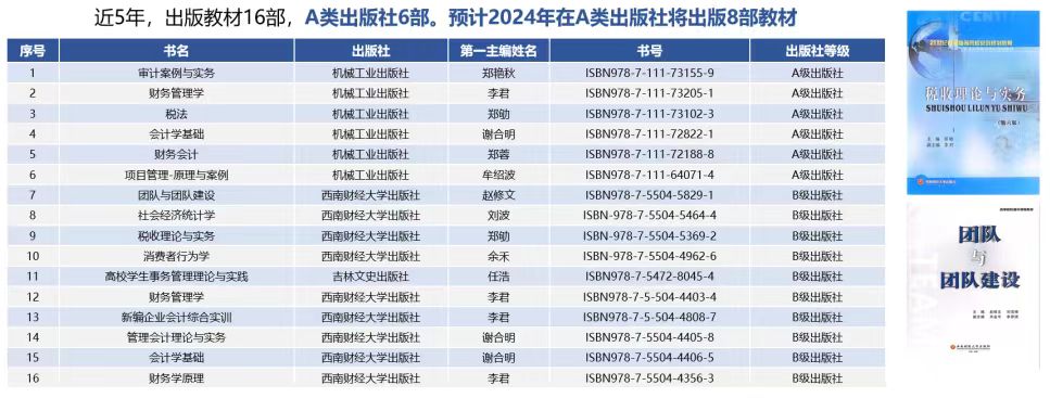 专业建设取得重大突破,2个专业获批国家级一流本科专业建设点(会计学、工商管理)。优质课程数量显著增加,现有6门省级一流课程,7门校级一流课程。近年来,荣获5项省级教学成果奖。近5年,出版教材16部,A类出版社6部。预计2024年在A类出版社将出版8部教材。