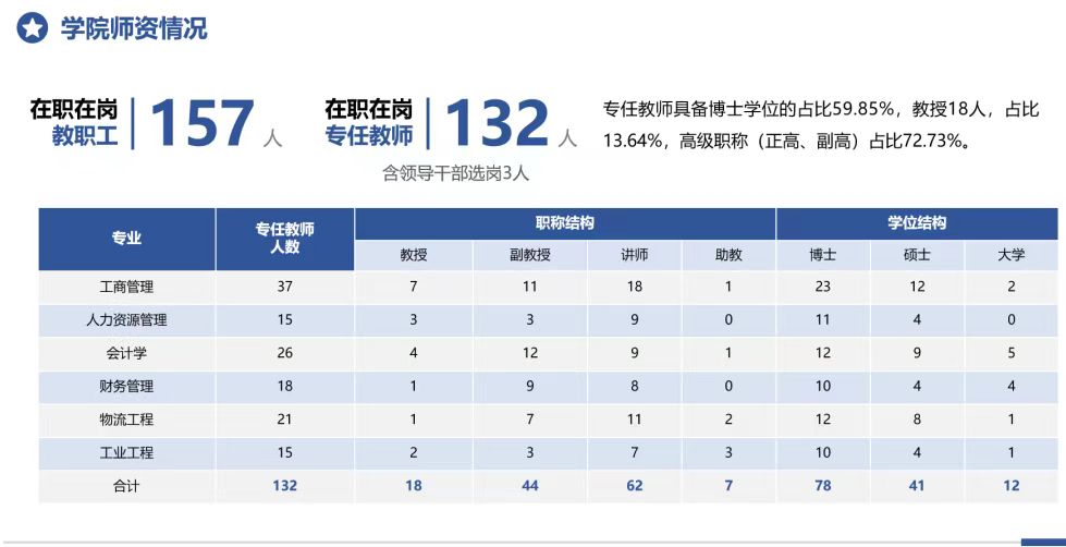 学院在职在岗教职工157人,在职在岗专职教师132人。而专任教师高级职称占比达72.73%,硕博士占比达94.70%。其中,国务院政府特殊津贴1人,国家教指委委员1人,四川省学术和技术带头人2人,四川省学术和技术带头人后备人选3人。