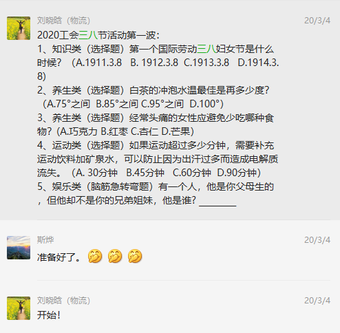 答题过程中,女职工们积极参与,争相抢答,大家热情高涨,气氛热烈,微信群内信息此起彼伏,好不欢乐。女职工们纷纷表示,这种特殊时期的特殊活动方式有创意,也有新意,在辛苦繁忙上网课的同时,也充分感受到了节日带给她们的喜悦和温暖。