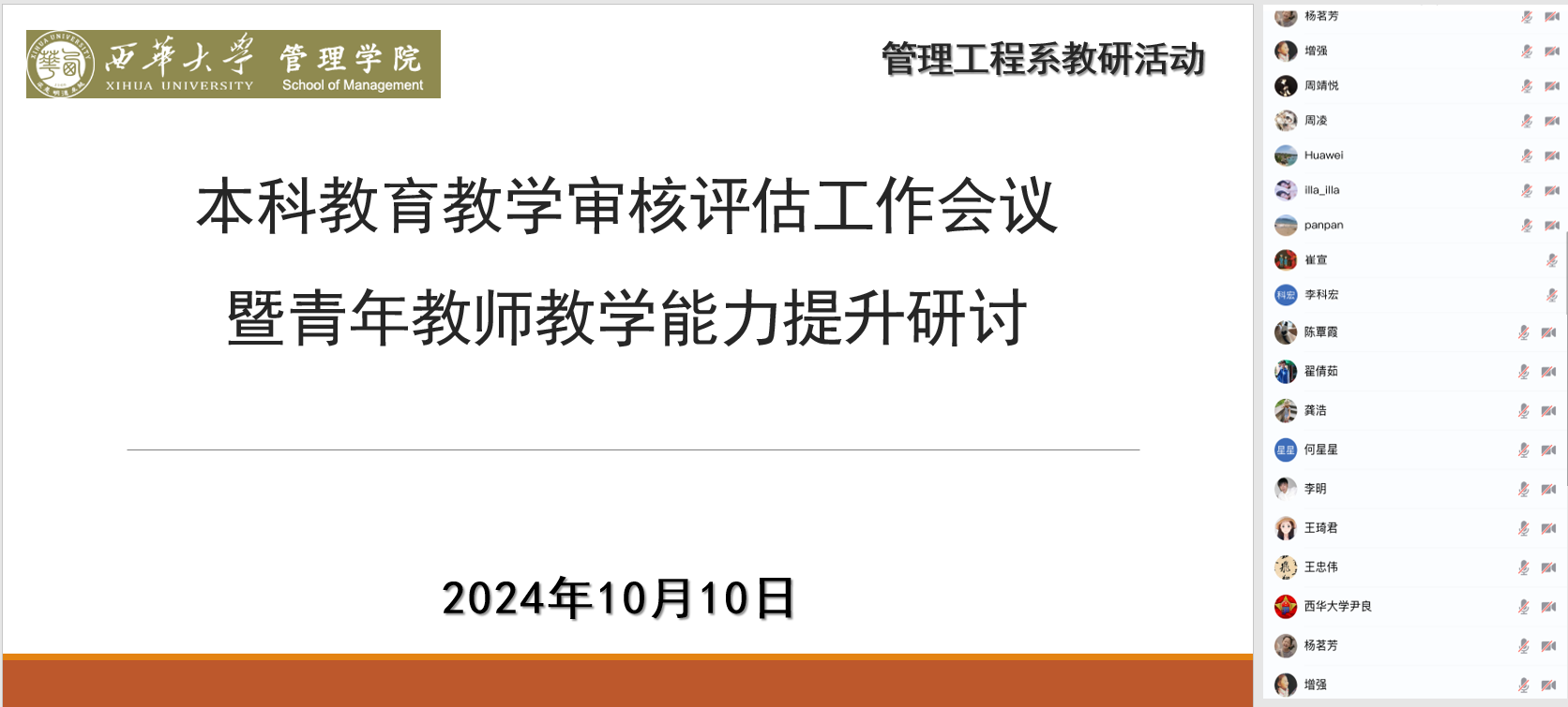 1010日下午14:30,管理工程系采用线下+线上形式组织全体教师围绕我校当前本科教育教学审核评估工作的重点事项集体学习了相关文件,并围绕如何提升青年教师教学能力上好一堂课,组织好课堂教学活动进行了教研讨论。会议上系主任黄国栋介绍了本次评估工作的重要性,要求全系教师按照学院要求认真整理教学资料、精心组织课堂教学活动,认真学习评估手册、学院人才培养目标和专业培养方案,确保本次评估工作顺利通过。学院党委副书记谢君强调本次评估工作对于学校的发展和专业建设都非常重要,希望管理工程系全体教师以学院培养数智化管理人才目标为方向,不断提高教学水平和科研能力,结合专业特点培养社会所需的数智化工程师人才。