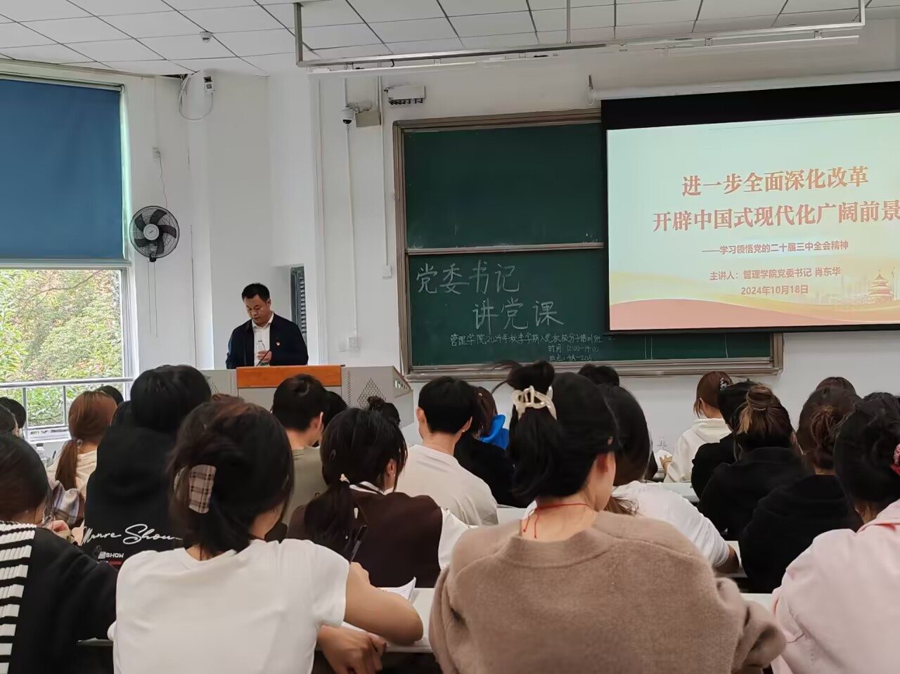 为深入学习贯彻党的二十届三中全会精神,提高同学们的党性修养和思想政治素质。2024年10月18日中午,betway88西汉姆联管理学院党委书记肖东华在4A-206为入党积极分子培训班的学员们讲授“进一步全面深化改革,开辟中国式现代化广阔前景”专题党课。管理学院入党积极分子培训班指导教师黄婉君出席会议,管理学院2024年秋季学期入党积极分子培训班全体干部及学员到场参加本次党课学习。