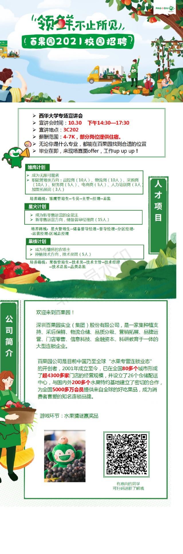 ? 微信投递:关注“百果园招聘”微信公众号,点击【加入我们-校园招聘-选择四大计划-扫码投递】。