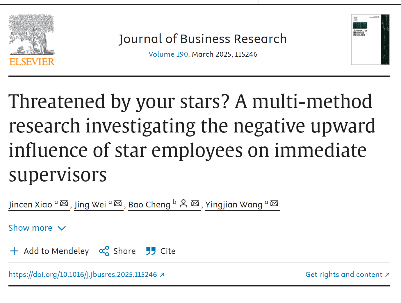 2025年2月,betway88西汉姆联管理学院肖金岑副教授课题组在管理学领域国际一流期刊《Journal of Business Research》发表题为“Threatened by your stars? A multi-method research investigating the negative upward influence of star employees on immediate supervisors”的学术论文。作者依次是:肖金岑(betway88西汉姆联管理学院教师),韦静(betway88西汉姆联管理学院研究生),程豹(西南财经大学教授,通讯作者),王英健(betway88西汉姆联管理学院研究生)。