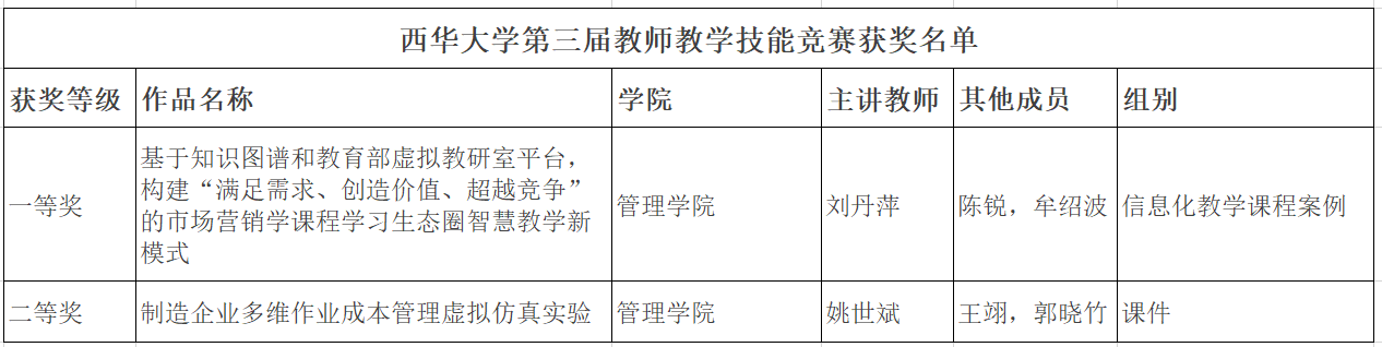 betway88西汉姆联第三届教师教学技能竞赛刘丹萍教师团队的《基于知识图谱和教育部虚拟教研室平台,构建“满足需求、创造价值、超越竞争”的市场营销学课程学习生态圈智慧教学新模式》项目,在“信息化教学课程案例”组别获一等奖。姚世斌教师团队的《制造企业多维作业成本管理虚拟仿真实验》荣获“课件组别”二等奖。