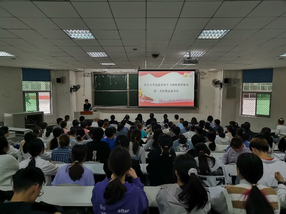 大会伊始,参会人员全体起立,齐唱《没有共产党就没有新中国》。副班长景静上台发言,她指出前阶段的学习还存在不足,鼓励学员调整状态,继续前进。在第一阶段学习工作中涌现出了一批表现突出的组长和学员,到场嘉宾和党校干部为他们颁发“工作标兵”和“学习标兵”、“进步之星”的荣誉证书。工作标兵代表郑丽春表示共建党校第46期管理学院班需要组长和组员团结一体、上下一心,希望在下一阶段学员能够更加积极地投入党校学习;学习标兵代表孙升帅同学则分享了自己党校学习的心得体会,并结合实例分享了学习方法。随后,组织员孙熊敏用纽带作比,生动地阐释了党务工作的作用,并希望学员们珍惜党校学习,加强党性修养;支部委员罗丹分点详细讲解了充实丰富的支部生活,并祝愿党校越办越好。《歌唱祖国》的旋律响起,会议圆满结束。