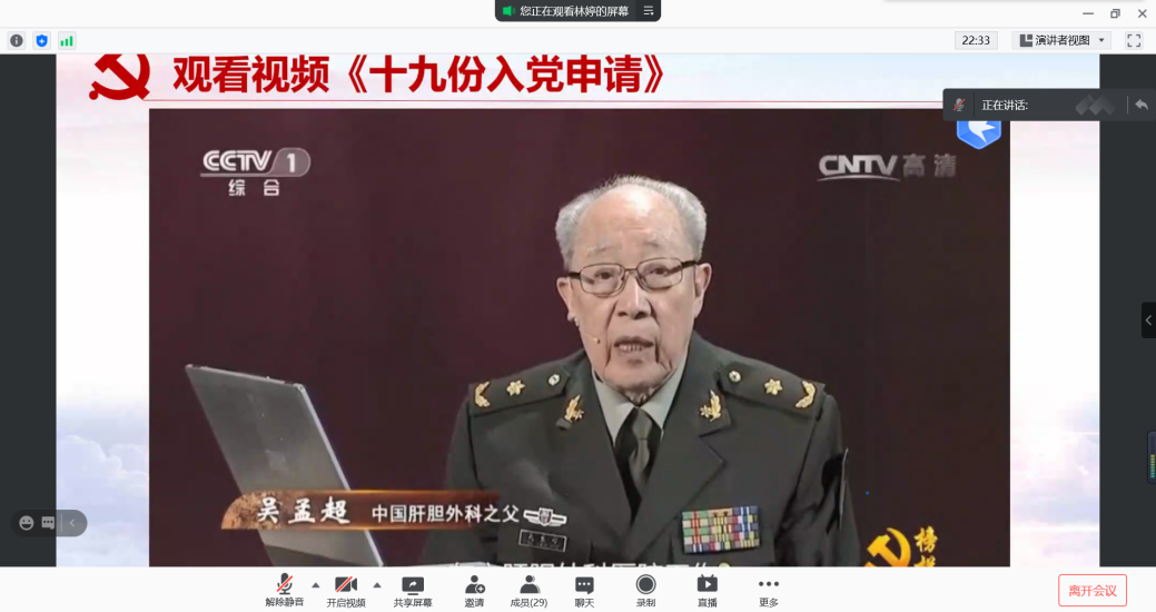 组织生活会共分为四个部分。在前两部分,支部党员一起回顾了袁隆平院士和吴孟超院士的生平简介与科研贡献,并观看视频《寄语青年》和《十九封入党申请》,深刻缅怀两位院士,向两位院士致敬。