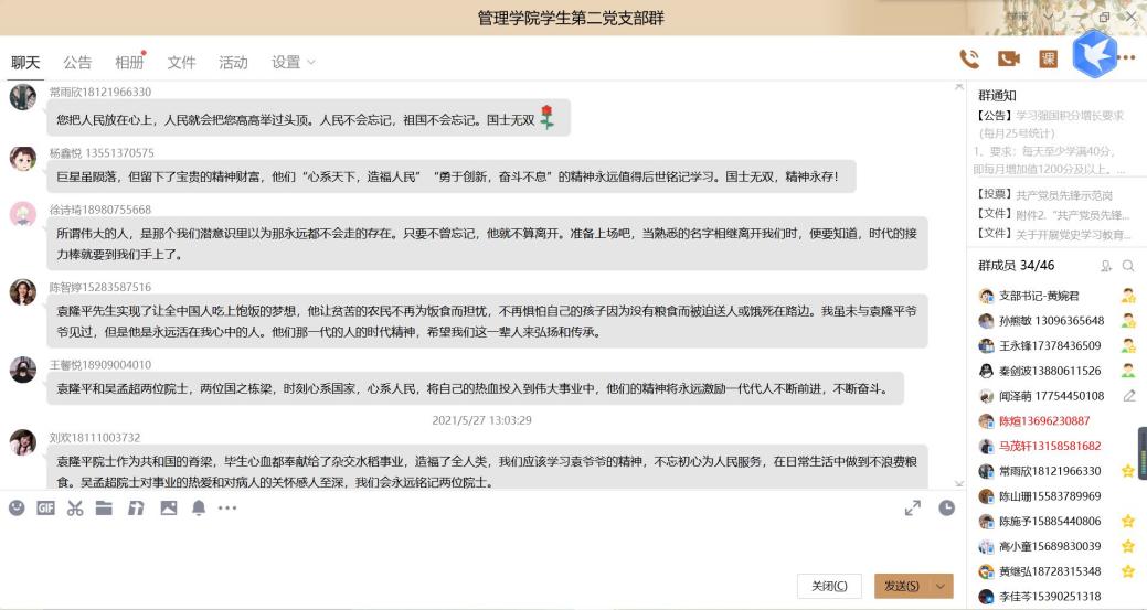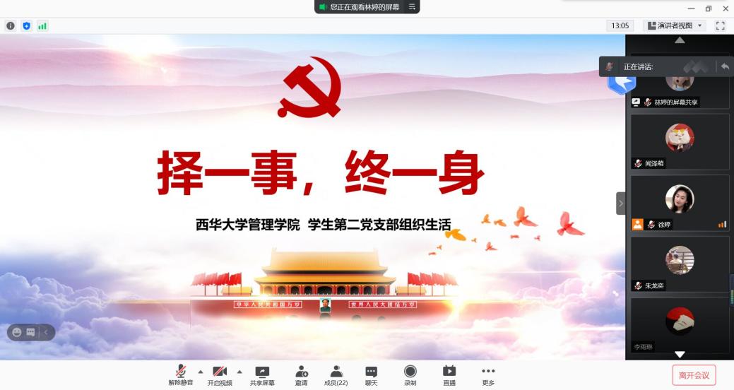 2021522日双星陨落、举国哀叹,为缅怀两位院士,传承伟大精神,管理学院学生第二党支部于5271220,召开以“择一事,终一生”为主题的线上组织生活会,会议由徐婷同志主持。