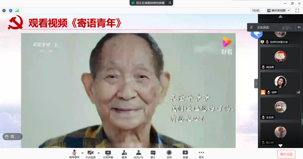 传承,是最好的纪念。在第三部分“接力奋发 当代青年人”,徐婷同志呼吁大家向两位院士学习,接过他们手中的接力棒,继续完成他们未竟的事业。择一事,终一身,践行为人民服务的宗旨,将初心作为前进的源泉。在观看完讲解和视频后,其他党员同志也感触颇深,纷纷发表了自己的感想,结合自身实践共同交流学习。