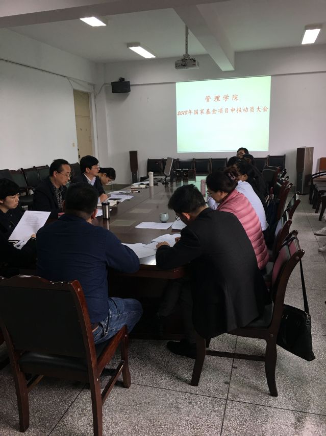 11月9日,管理学院在3E-402会议室召开了2018年国家基金项目申报动员大会。大会由副院长牟绍波主持,谢合明院长、龙雅芳书记及学院部分博士老师参加了会议。