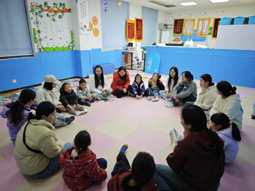 培训伊始,小屋负责人锚定了服务的核心:这里的主角是社区低龄儿童,志愿者的任务不只是“看顾”,更是以书为桥梁,搭建起进入孩子们世界的通道,而“耐心蹲下来、细心听进去、责任心扛起来”,正是让这场书香志愿落地的关键。紧接着,往期优秀志愿者代表把服务经验融入到具体的书屋日常里:比如书架上的绘本该怎么摆放,才能让孩子踮起脚就能拿到喜欢的书;遇到坐不住的小朋友,不用急着“规训”,可以顺着他们的注意力,从绘本里的插画聊起,慢慢把兴趣引到故事里;要是碰到孩子突然闹情绪,先递上一本色彩明亮的小书、再轻轻拍着背安抚,比反复劝说更能让孩子平静下来。这些接地气的分享,让志愿者们彻底放松下来,大家自然地围坐成圈,就“如何不打扰孩子自主翻书又能提供帮助”“怎样引导内向孩子参与共读”等问题交流探讨。现场氛围热烈鲜活,大家以手边绘本为载体模拟伴读场景,轻快的朗读声与贴合情节的表情动作相映成趣。