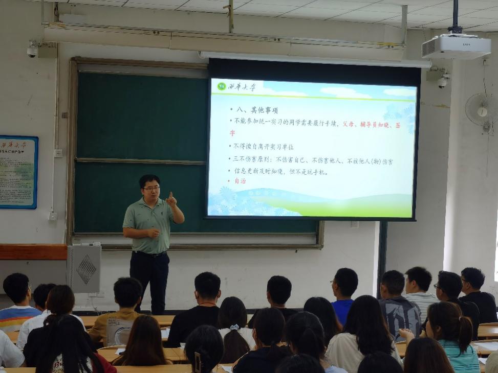 会上,丁老师首先作了动员讲话,他向同学们具体介绍了本次实习工作的计划安排,围绕住宿、出行管理、遵规守纪、自我防护、人身财产安全等方面提出具体要求,并就实习报告撰写、专业难题解决等方面对提高实习质量提出指导性意见。