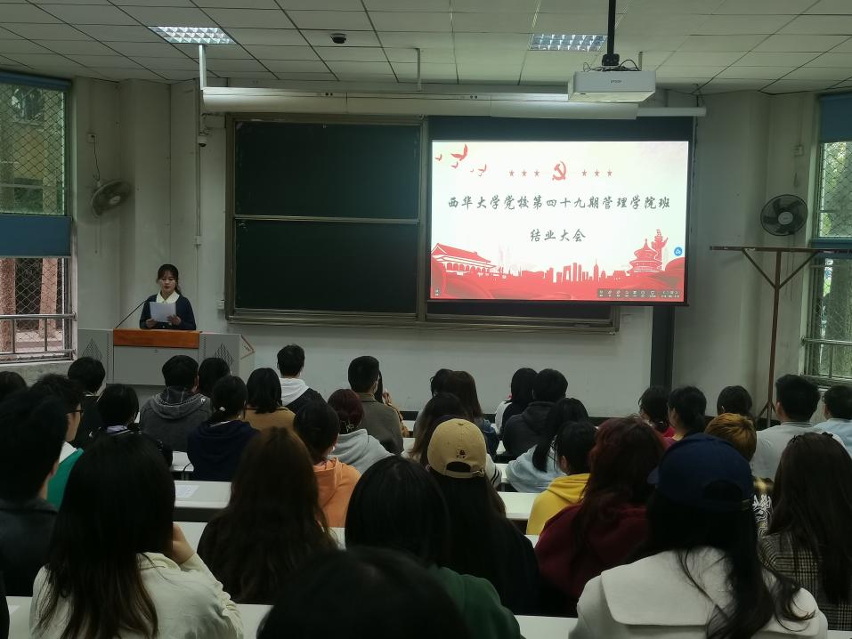 大会伊始,到场嘉宾经主持人介绍后在热烈掌声中入座。全体参会人员齐唱《没有共产党就没有新中国》,歌声铿锵有力。和光同尘,与时舒卷,戟鳞潜翼,思属风云。结业视频《与光同尘,与时舒卷》展现的不仅仅是在党校短暂的学习生活,更是学员和干部们在这段时光里努力的缩影。大会上,黄婉君老师与党校班长龚春旭分别为这一期的优秀组长和优秀学员颁发奖状,并就干部们的付出给予极大的肯定和高度的赞扬,也衷心祝贺学员们顺利结业。党校的生活是短暂却灿烂的,第49期学员代表朱模珊回顾自己在党校学习的过程以及实践活动中的经历,向大家分享了自己的收获与感悟。随后,黄婉君老师表示,第49期的结业标志着一个新起点的出现,她希望学员们继续努力,发扬肯奉献、敢担当、有作为的精神。国家正处于向第二个百年目标进军的关键时刻,作为新时代的青年要在这其中注入更新的血液,更多的力量。最后,在《歌唱祖国》的嘹亮歌声中,第49期管理学院班的党校生活正式落下帷幕。