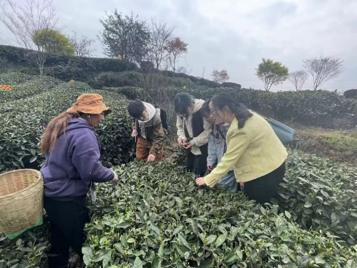 随后,张忆萍带领调研组参观了蒙顶山茶叶现代农业园区和牛碾坪万亩观光茶园,团队成员纷纷走进茶园,与茶农进行深入交流,了解当地茶叶产量、茶农收入以及国家乡村振兴战略实施以来茶农的生活转变。调研团队也在茶农的指导下体验采茶,辨别茶叶的品种与品质。