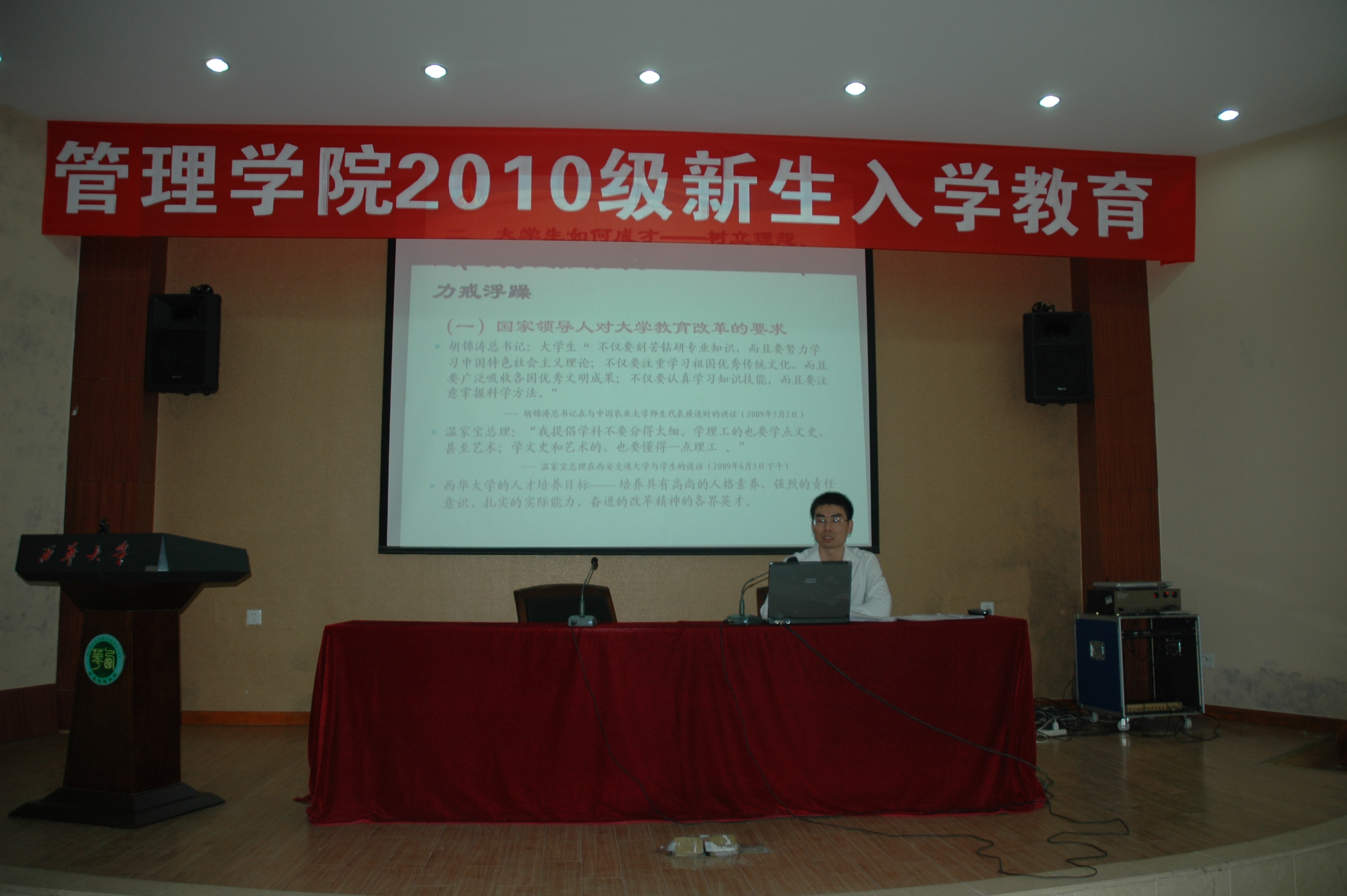 管理学院今年的新生入学教育工作根据不同专业、不同主题分别展开。连续六天的入学教育分市场营销、工商管理、财务管理、会计学、工程管理等专业分别进行。入学教育工作展开的如火如荼,学院领导、教师与学生之间的距离快速拉近,新生们的视野得到了开阔。专业教育中各位老师深入浅出的讲解使得同学们对本专业有了更深一步的认识;校情校史教育现场,秦昌明教授幽默诙谐地讲述道出学校发展的艰苦历程,迎来了阵阵感动与掌声;学籍管理和学分与选课教育在学院教学办公室黄敏老师的讲解下,让同学们更清楚了大学与高中学习方式的不同;心理健康教育让同学们了解了大学生活中也许会遇到的困扰以及应对的方法;优秀大学生宣讲和交流现场异常活跃,在第二课堂、科技比赛、学习成绩和学生干部等方面各有突出特点的优秀同学通过讲述自己的大学故事,让新生们从不同视角更深入地了解了大学真实生活,同时也对自己的未来充满憧憬与向往;而丰富多彩的班会活动,加深了同学们之间的情谊,为下一步开展班级工作打下了坚实的基础。