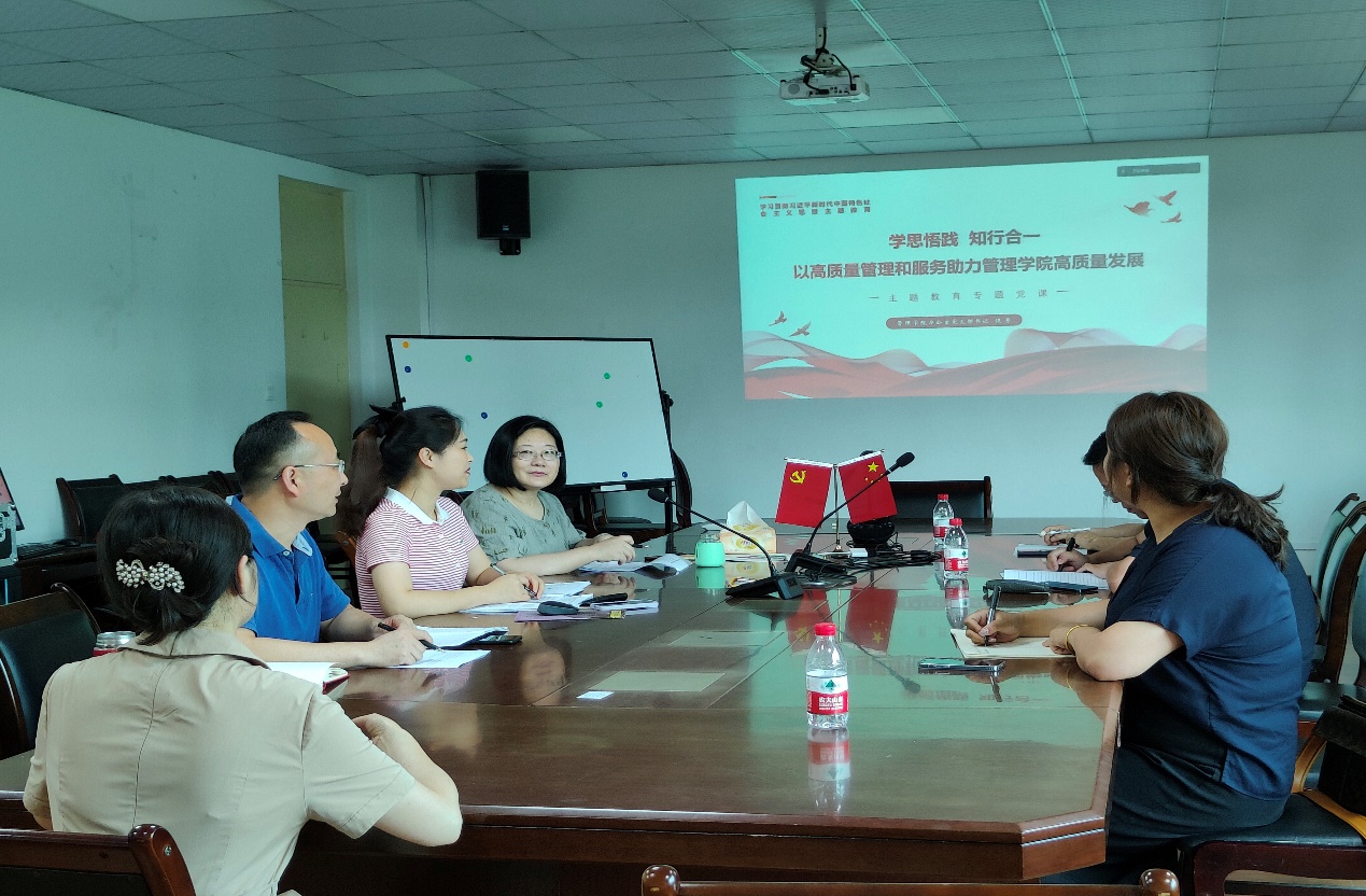 2023年7月6日下午,管理学院办公室党支部采用线上线下结合的方式召开党员大会,支部书记饶芳同志以《学思悟践,知行合一,以高质量管理和服务助力管理学院高质量发展》为题,为支部党员同志讲专题党课。